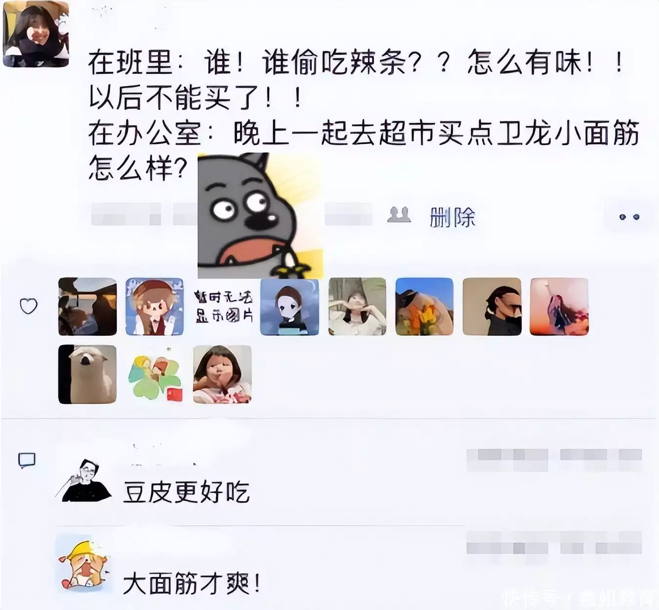 上课时形象严肃,下课后说不定还会在办公室里偷偷吃“辣条”!也是很真实了,不允许学生在教室里吃辣条,但老师却能在办公室里吃,但女老师发朋友圈忘屏蔽学生,也让场面一度很尴尬了!