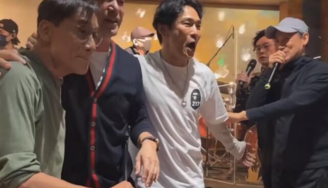 视频的后半段,张学友终于现身,穿着一身深色衣服,头戴棒球帽的他,衣着很是低调。他拿着麦克风,跟另一位“乐坛校长”谭咏麟一起献唱生日歌。坐在凳子上的钟镇涛此时已喝得满脸通红,只见他招呼梁家辉与杜德伟过来,3人紧紧地搂着一块笑开怀,看得出来彼此感情非常好。