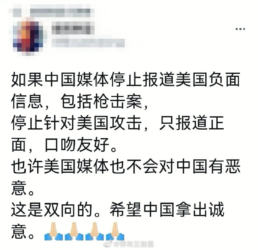 #祖国反黑站[超话]#崇洋者真的是太搞笑了,居然有人发帖呼吁中国媒体“拿出善意”,让中国人不要报道美国的负面新闻,只报道正面信息,从而获得美国的谅解。