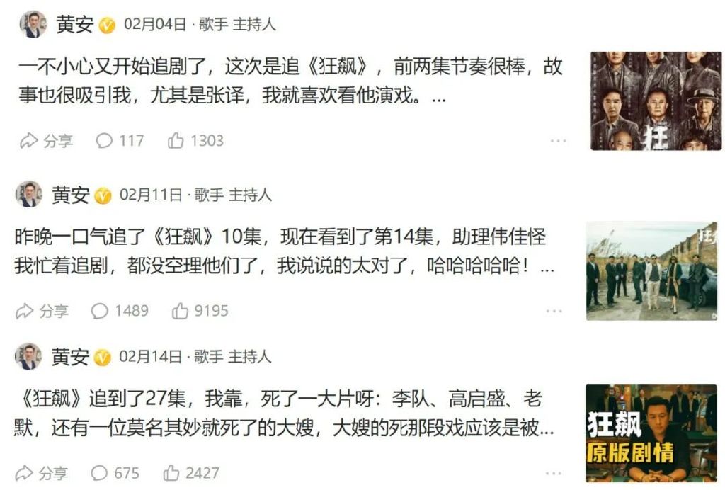 此外,曾靠一首《新鸳鸯蝴蝶梦》火遍全国的台湾歌手黄安,不仅追剧,还在网上发表了观后感。