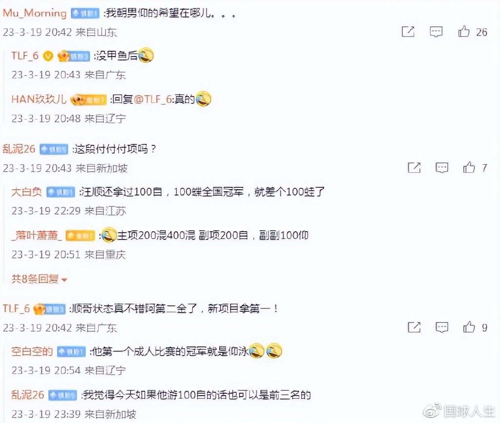 不少泳迷直接表示,夺冠成绩54秒多,这不是搞笑吗?可惜,徐嘉余没有参加这次比赛,因为前段时间的风波,他逐渐消失在泳迷的视线中,何时复出参赛还是未知数。在这种情况下,中国游泳队迫切需要培养年轻人才,要不然在接力比赛中太吃亏了。其实,对于年轻运动员来说,汪顺就是好榜样,他在加冕双冠后表示,奥运冠军就是一个起点,小时候是热爱,如今是责任,带着责任和努力继续为中国游泳贡献力量。汪顺的意思很明确,刻苦训练才是取得好成绩的关键。