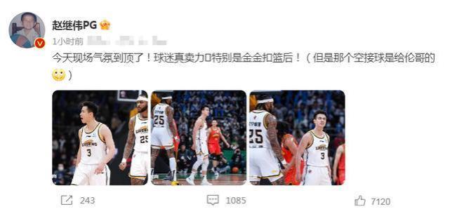 赵继伟本场送出了15次助攻,将全队都给盘活了,其中有一次,是快攻中给张镇麟的空接,点燃了现场气氛,嗨到顶了。赛后,赵继伟在社交媒体上发文称,其实那次空接,是给伦哥郭艾伦的。