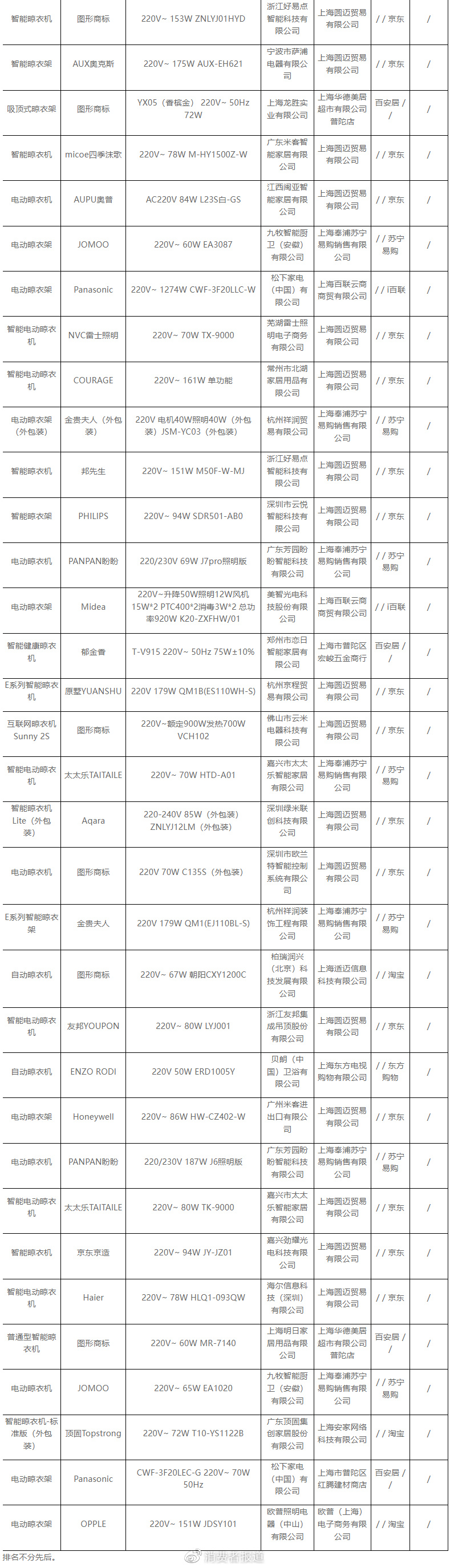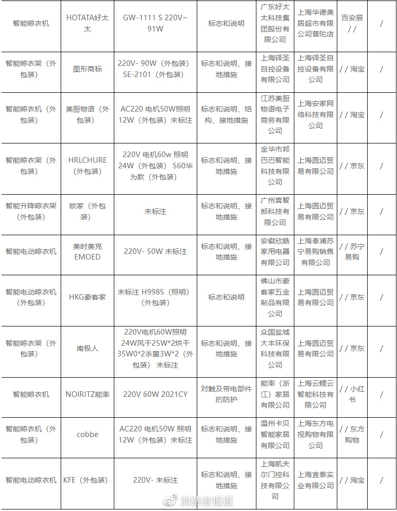 其中,好太太、美厨物语、欧家、美时美克、南极人等11批次电动晾衣机抽查不合格,不合格项目主要包括标志和说明、接地措施等。