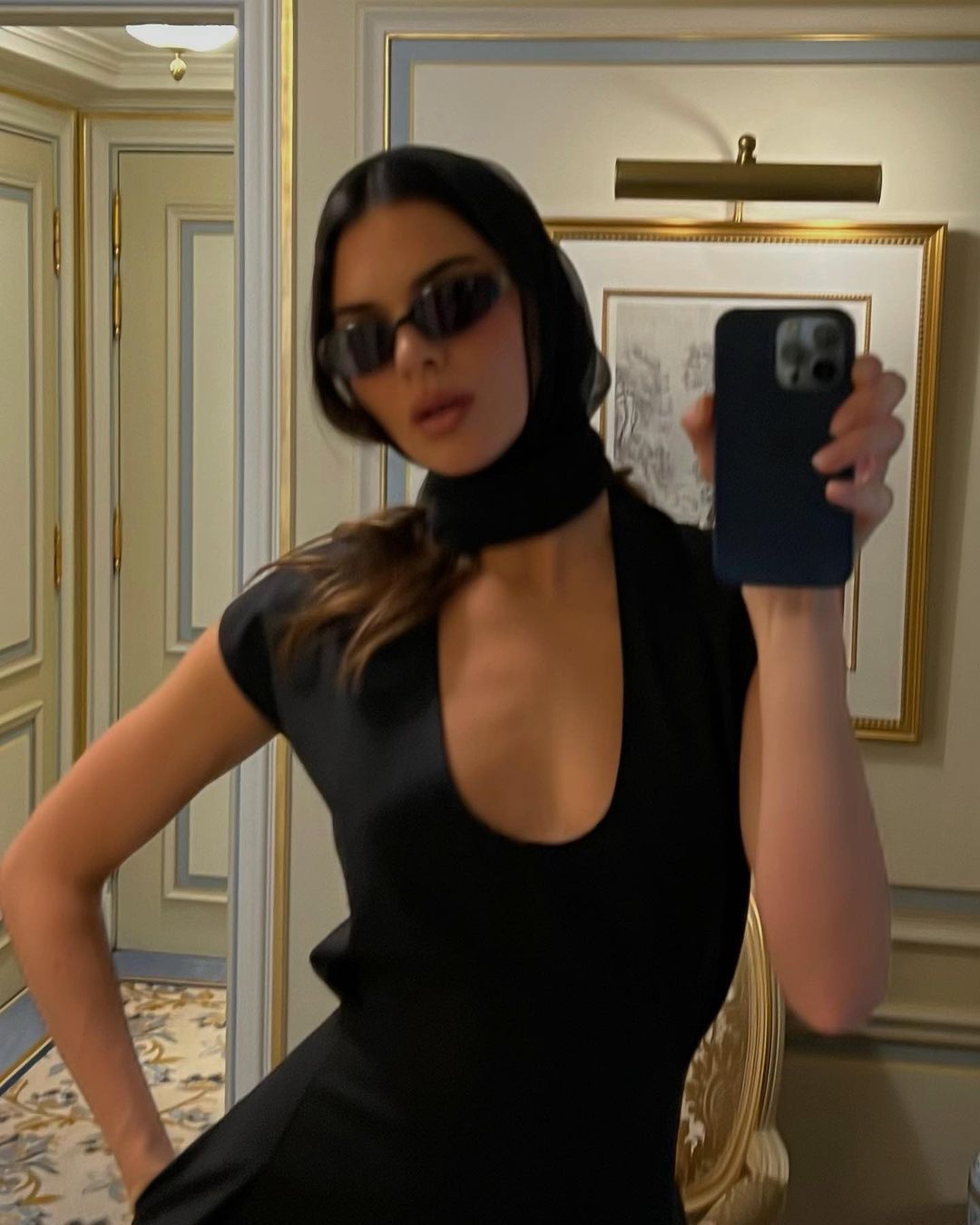 身穿The Row 2023春夏系列黑色修身裙,搭配同色系头巾和墨镜,还是一贯的经典、低调、极简,配上浪漫的法国街道,故事感直接拉满。这次的all black 造型有望成为下一个经典。