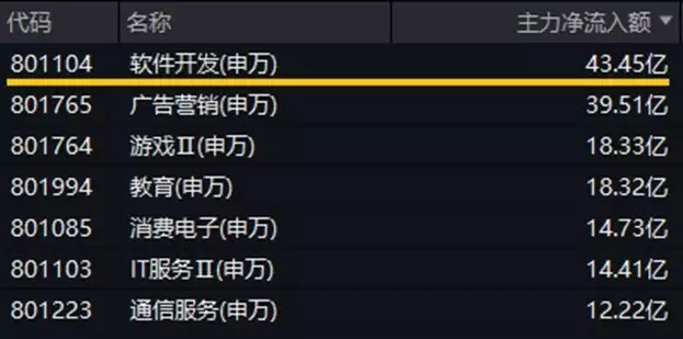资金面上,主力资金大举涌入软件开发行业,截至发稿,软件开发行业吸金43.45亿元,高居所有申万二级行业首位!