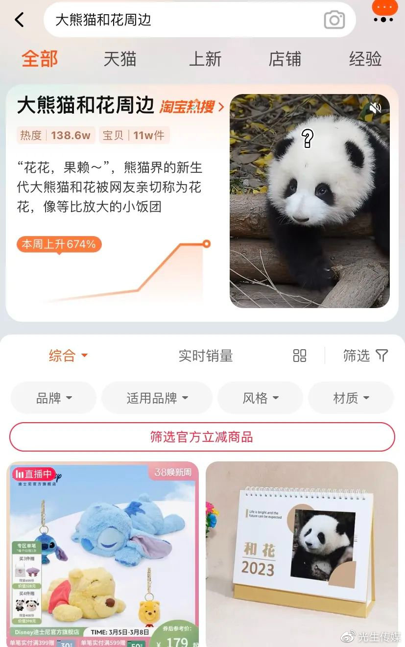 而近期,随着熊猫热不断升温,熊猫文创产品的销量也逐渐上升。据报道,3月3日,“大熊猫和花周边”冲上淘宝热搜榜,“和花”周边近七天销量飙升超906%,印有“和花”图案的手机壳、日历、钥匙扣等物品成为爆款。