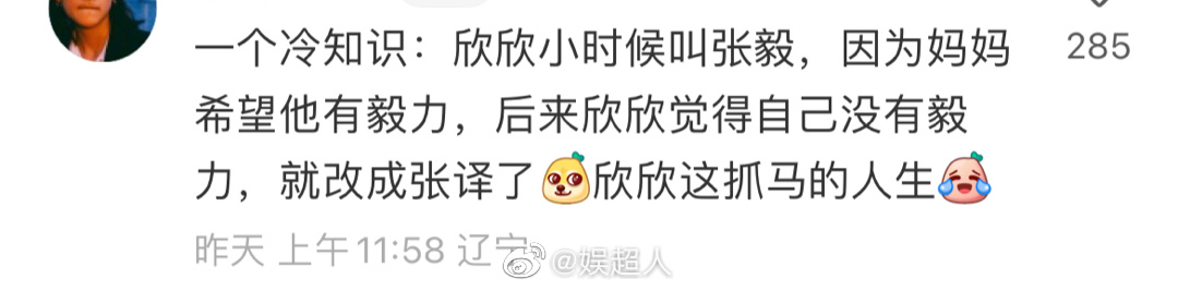 首页 > 冷知识 > 正文 冷知识:张译原名叫张毅,因为妈妈希望他有毅力,后来他觉得自己没有毅力…… GoLove · 浏览 155 · 点赞 0 · 评论 0 · 2年前 (2023-12-14) #张译原名张毅# 冷知识:“张译原名叫张毅,因为妈妈希望他有毅力,后来他觉得自己没有毅力,就改名叫张译了”,以为是个段子,搜了一下,没想到是真的 –> 已有0人点赞 打赏一下作者 上一篇 内涵段子:昨天下班路上遇到女同事,她对我说道:别急,你等我一会! 下一篇 内涵段子,让人深思 猜你喜欢 哈哈哈哈哈哈哈~这个真的太搞笑了!怎么办?陈伟霆你快来告诉我要怎么办! “直男”说话就是没轻没重的! 令人心动的offer 令人心动的offer7 搞笑 男子醉酒跳搞笑舞蹈引家人发笑 发表评论 电子邮件地址不会被公开。 必填项已用*标注 评论 姓名 * 电子邮件 * 站点 评论信息